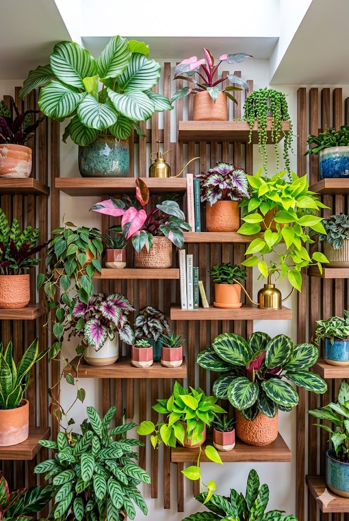 - The Plant List: Diversity is key. Feature highly varied patterned leaves, like a large Calathea Orbifolia or a vibrant Pink Princess Philodendron. Mix with varied Rex Begonias and trailing vines of trailing Pothos and Neon Philodendron. Tuck in small books and geometric pots for unexpected pops of personality.