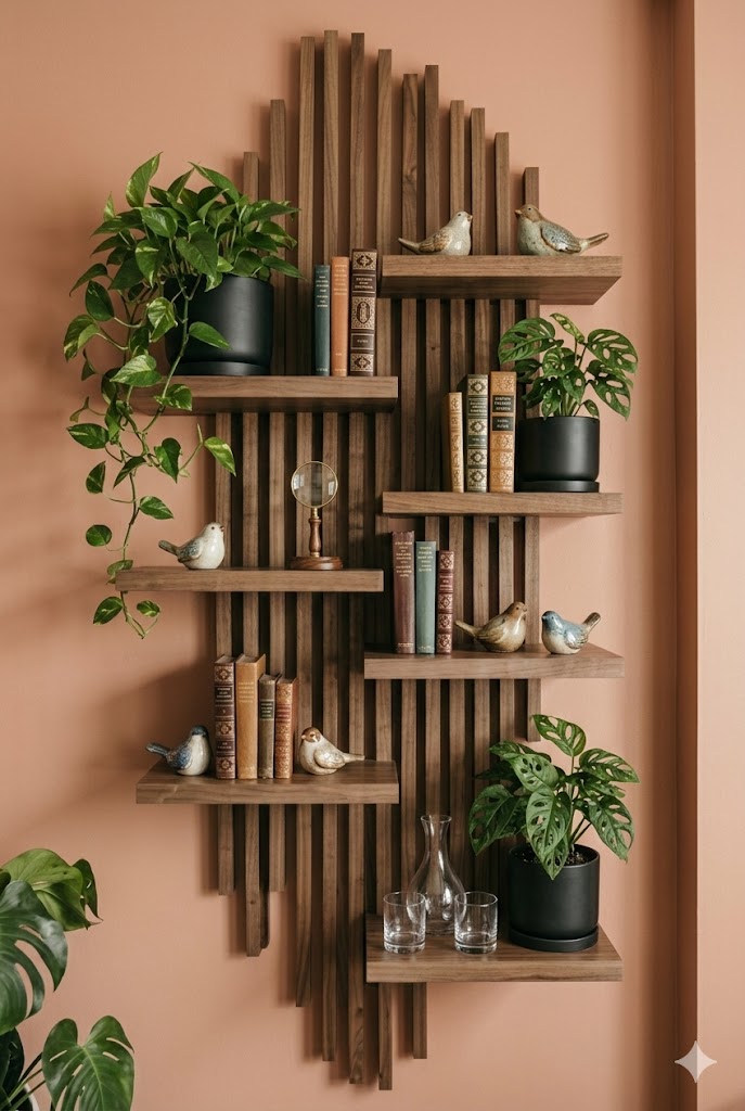 - The Vibe: Practical, organized, and curated. This design utilizes the staggered, irregular walnut floating shelves of the input unit not just for plants, but also for books and artisanal objects.